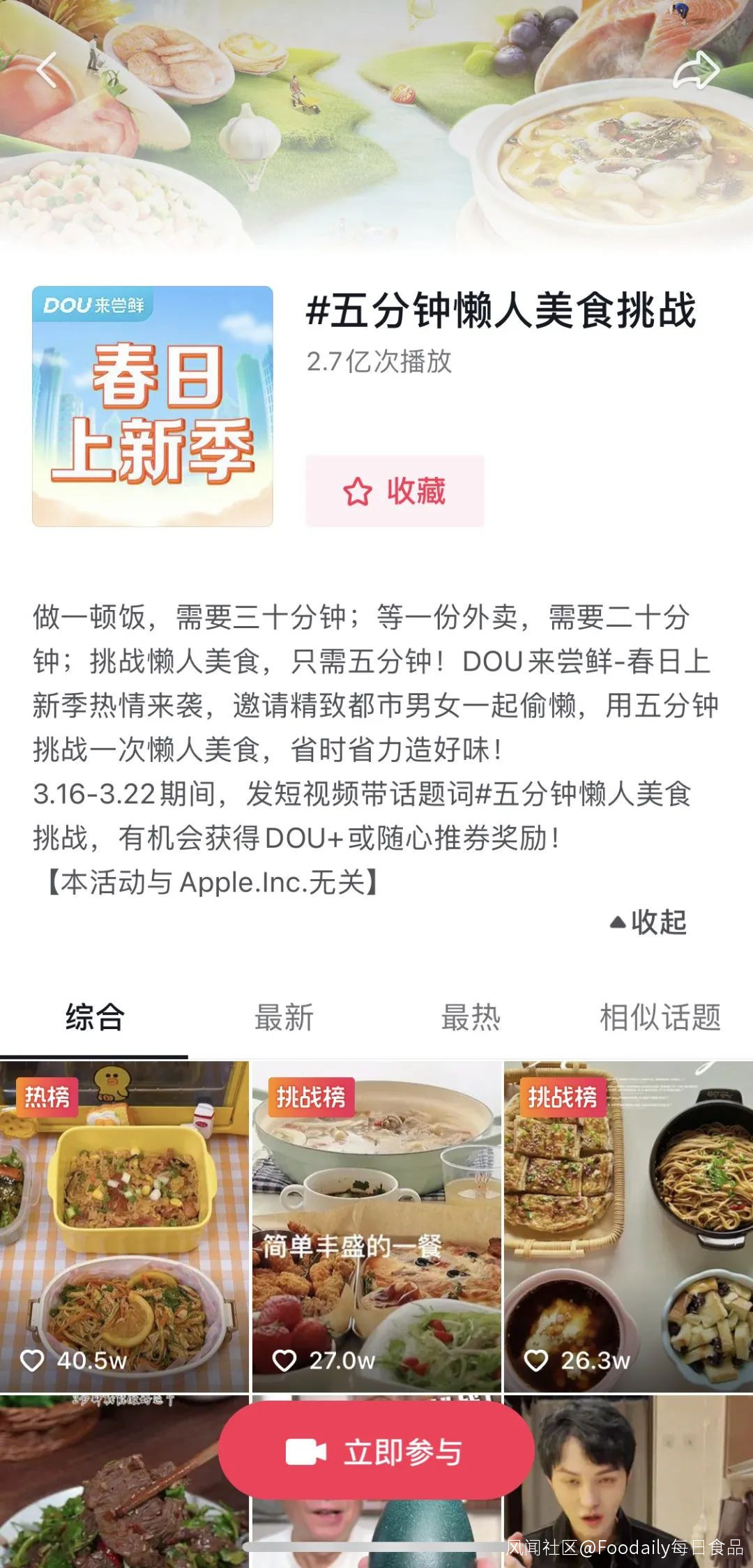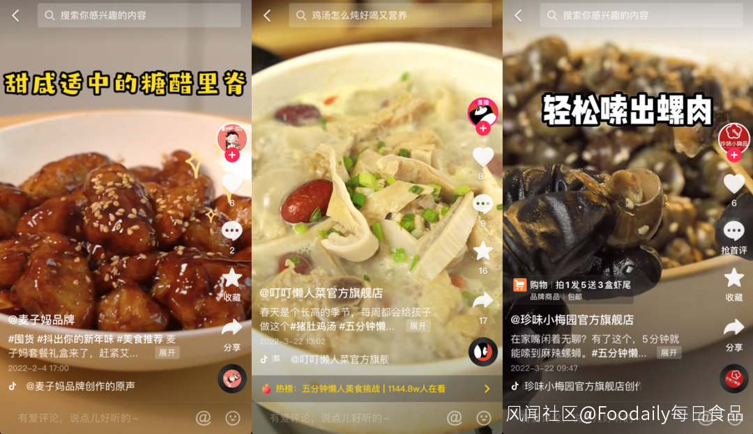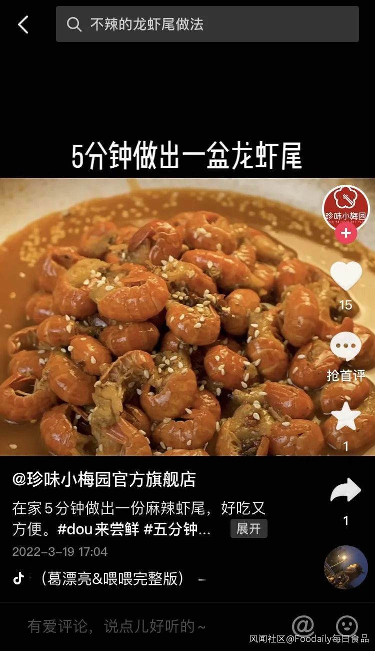 經過了解,Foodaily發現,在許多預製菜品牌入駐抖音電商的同時, 抖音電商平台也針對預製菜品類開啓了“「DOU來嚐鮮·春日上新季」”活動,聯動行業、品牌、內容創作者,以短視頻內容為切口,提升消費者對優質預製菜的感知,也通過興趣電商推動預製菜行業的發展。