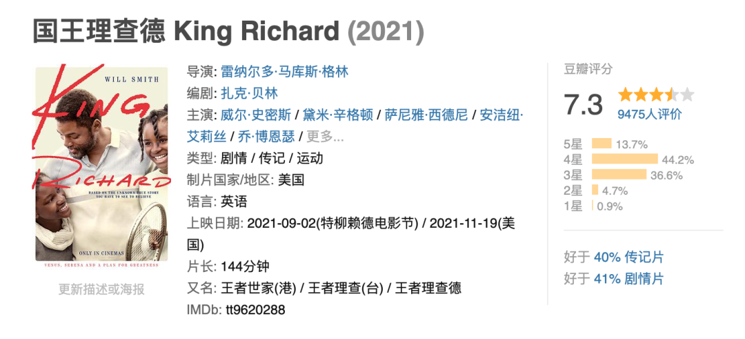片子可以看作美國版《摔跤吧爸爸》,講威爾·史密斯飾演的美國虎爸,如何把貧民區出生的兩個女兒培養成叱吒風雲的體育明星。