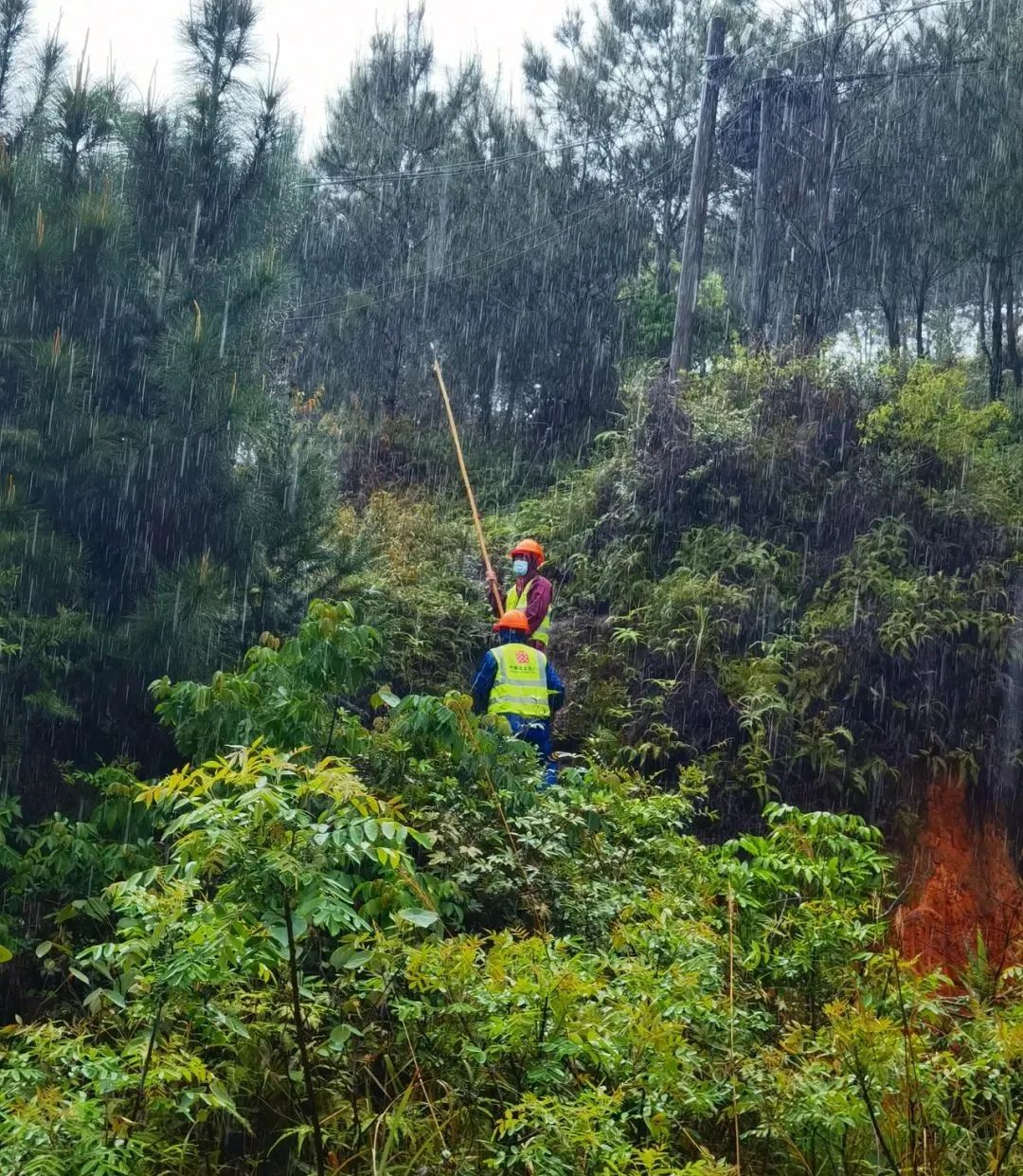 山林中暴雨密注。現場雨衣不夠,不少施工人員穿着淺黃色的一次性塑料雨衣,頭戴施工帽,徒手抬起光纜,走過泥濘的鄉間土路,將光纜抬過不時出現的小山頭,注意着腳邊的水坑和石頭,不時相互搭把手以免滑倒。雨水透過縫隙,不一會兒,所有人的衣服都已經濕透。