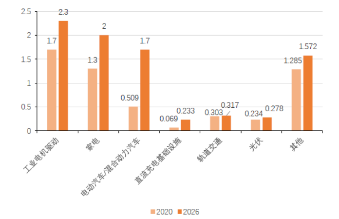 圖3:2020-2026年,功率半導體中的IGBT在不同應用市場的發展預測(十億美元),資料來源:天風證券