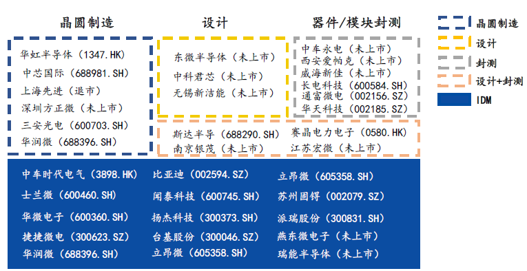 如果再結合產業鏈配套以及非上市公司,我們可以清晰地看到目前國內的功率半導體已經完整地覆蓋了從晶圓製造、設計到模塊封測的全部環節,還有不少公司比如中車時代電氣、比亞迪、士蘭微等等是IDM(即全產業鏈一體化的)。