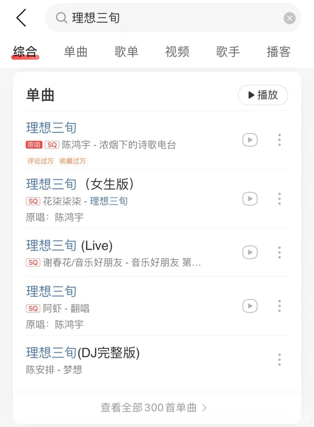 長久以來,與“版權不足”一同存在的問題,還有網易雲音樂上充斥着大量翻唱歌曲,僅《理想三旬》一歌Cover版就高達300餘首,這並不是孤例,林宥嘉的《天真有邪》原唱並不在網易雲音樂,但也存在大量Cover版。