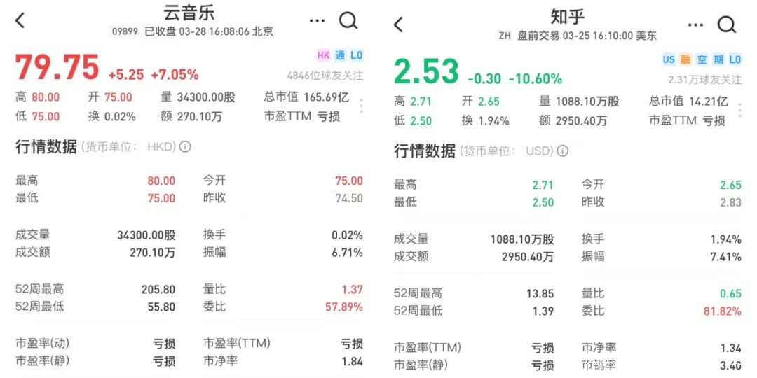 2021年12月2日,網易雲音樂上市首日股價跌幅達2.49%,報199.9港元/股,實現破發,當日總市值為415億港元。之後的三個多月裏,網易雲音樂股價暴跌60%,市值蒸發達250億港元。在資本市場,網易雲音樂的股票成交量和換手率甚至難敵營收體量僅有30億元的知乎,交易低迷,也證明了網易雲音樂的股票在流通性和變現上的弱勢。