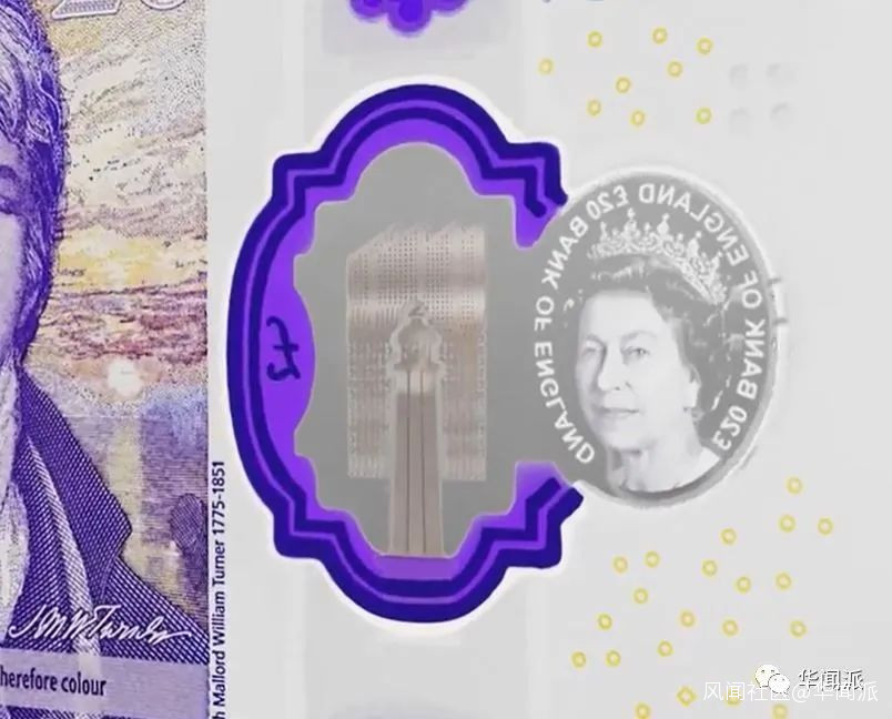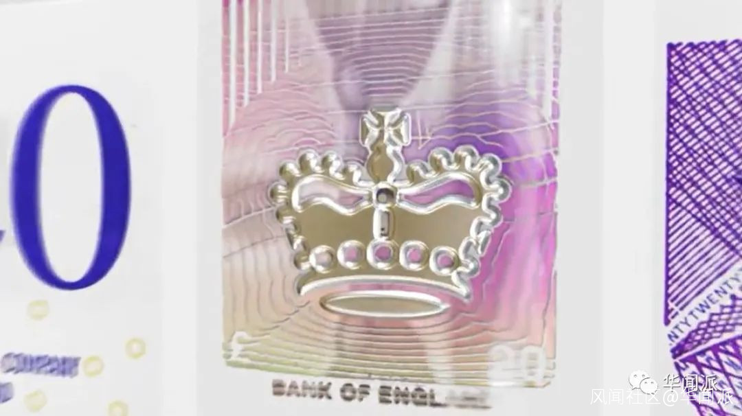·銀色的王冠是3D效果的,下面寫着“Bank of England”,背面則是一個圓形的紫色箔片,裏面有字母“T”;