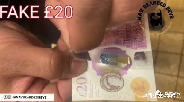 在視頻裏,他從一張20鎊紙幣上剝下了一層貼紙。這一撕,不僅把上面的王冠和透明窗口上的燈塔撕下來了,紙幣上還出現了 “樣板鈔票”的字樣。