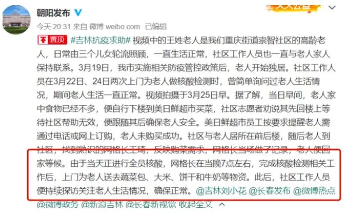 老人的問題後來得到了妥善解決,當地社區安排了蔬菜包大米之類的物資送到家裏。
