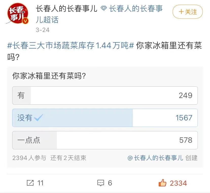 有長春本地自媒體做了個調查,問長春人冰箱裏現在還有沒有菜。