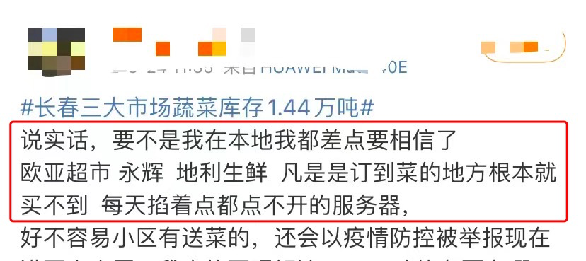 雖然前幾天官方説蔬菜供應充足,長春三大菜市場蔬菜庫存1.44萬噸,但底下大量當地網友説自己根本買不到菜。