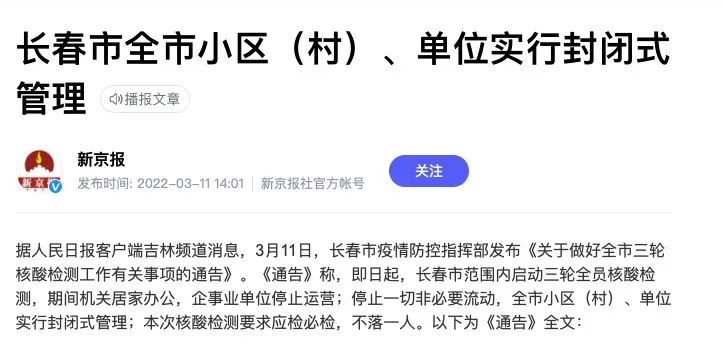 3月11日,長春發佈疫情防控通知,全市各大小區(村)和單位都實行封閉式管理,學校停課,公共交通全部停運。