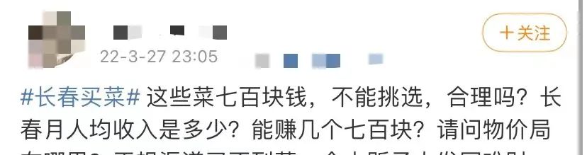 昨天微博上有個長春網友發出來的帖子,就是下圖,七袋蔬菜,買回來花了700多塊。