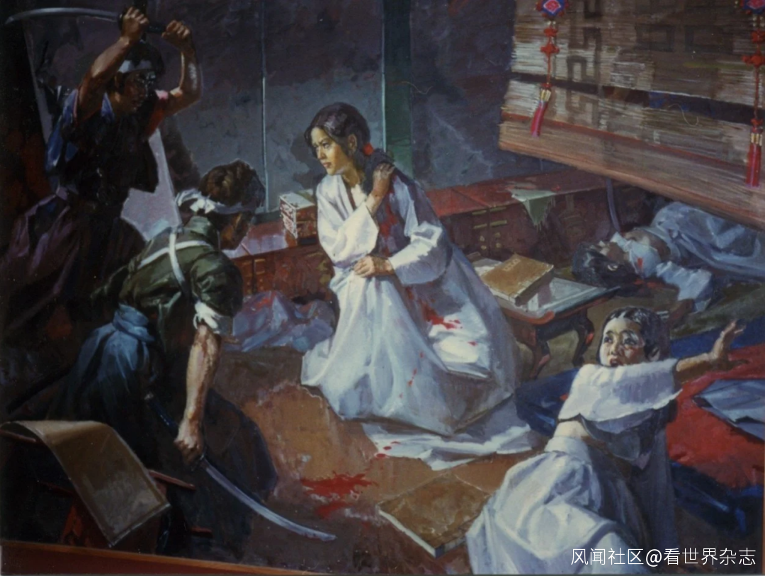 據當年目擊者事後稱,兇手們朝閔妃胸口和胸部踩了幾腳,並用日本刀像捅馬蜂窩一樣,反覆刺向閔妃的身體。