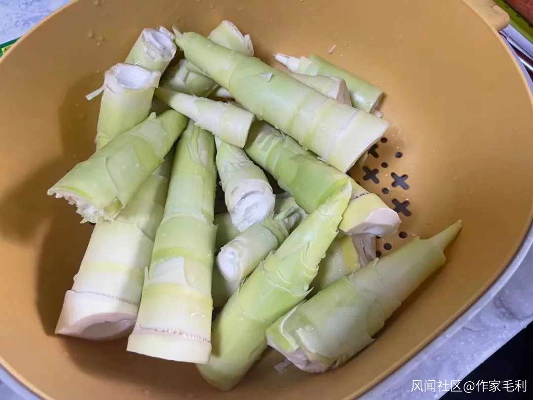 昨天我解釋過了,因為兒子艾文喜歡捉蟲子,他拿着他的昆蟲採集筐,在小區裏兜來兜去的時候,忽然發現了一片竹筍。有網友説,這是江浙滬人自帶的挖竹筍基因,也有人説,這是人類採集食物的本能。總之,兒子不管不顧,挖了一整筐竹筍回來,宣佈我們家可以少買一點菜,還宣佈吃完他還可以再去挖。