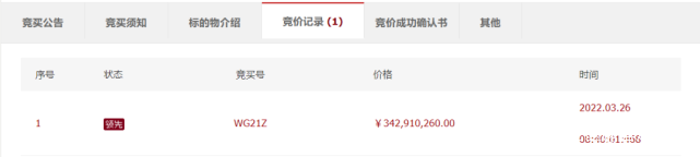 具體來看,此次拍賣2022年3月25日上午10:00開始,26日10:00結束。最終競價結束之際,僅一人報名,最終的成交價格和起拍價34291.026萬元相同。從競價記錄可看出,此次競買報名人員出價時間較晚,在競拍結束前兩個小時出價。