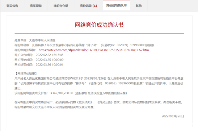 根據北京產權交易所網絡司法拍賣平台發佈的《網絡競價成功確認書》:用户姓名大連鹽化集團有限公司通過競買號WG21Z於2022年03月26日在大連市中級人民法院於北京產權交易所司法拍賣平台開展的“長海縣獐子島投資發展中心持有證券簡稱“獐子島”(證券代碼:002069)109960000股股票”項目公開競價中,以最高應價勝出。該標的網絡拍賣成交價格:¥342,910,260.00。