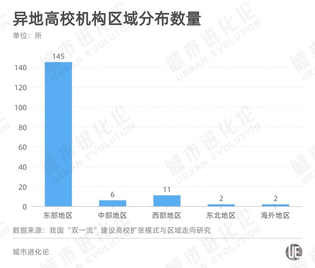 根據蘭州大學高等教育研究院副院長盧彩晨等在《我國“雙一流”建設高校擴張模式與區域走向研究》一文中統計,截至2020年4月底,“雙一流”建設高校異地辦學166所,其中逾87%流向東部。