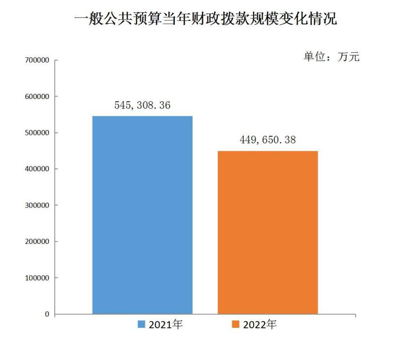 其中,2022年佔比最大的一般公共預算撥款收入449,650.38萬元,比2021年執行數545,308.36萬元(2021年預算數387,149.3),減少95,657.98萬元,壓縮了近10億元。主要原因是,落實關於過緊日子的有關要求,重點壓減了公用經費和文化藝術活動及扶持發展、文旅能力建設及保障等項目支出。