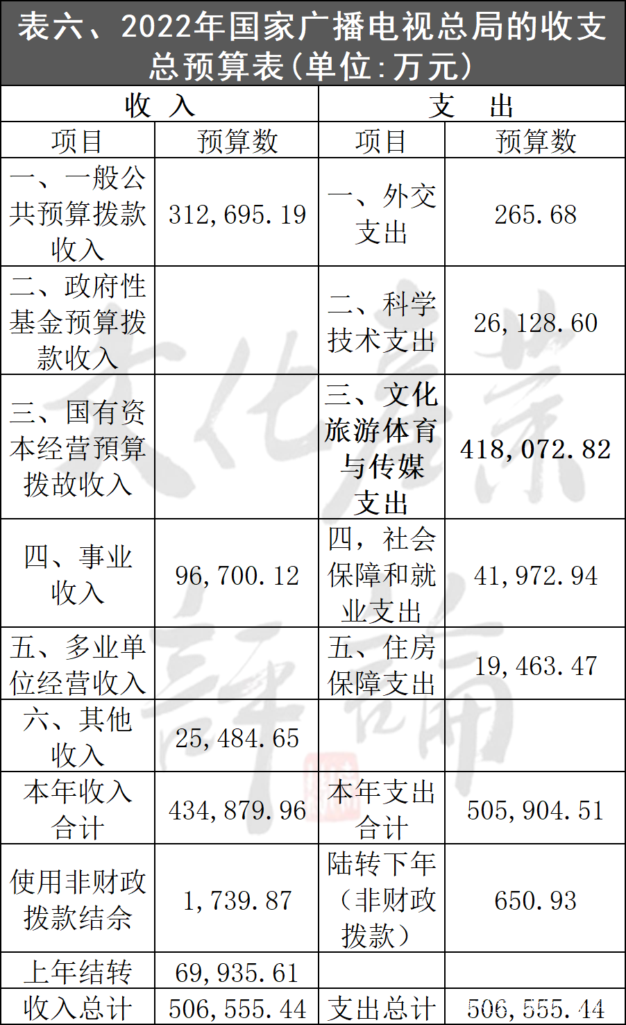 **從文化廣電系統內來看,**2022年國家廣播電視總局的收支總預算為506,555.44萬元(詳見表六)。其中,上年結轉69,935.61萬元,一般公共預算撥款收入312,695.19萬元,事業收入96,700.12萬元,其他收入25,484.65萬元,使用非財政撥款結餘1,739.87萬元。