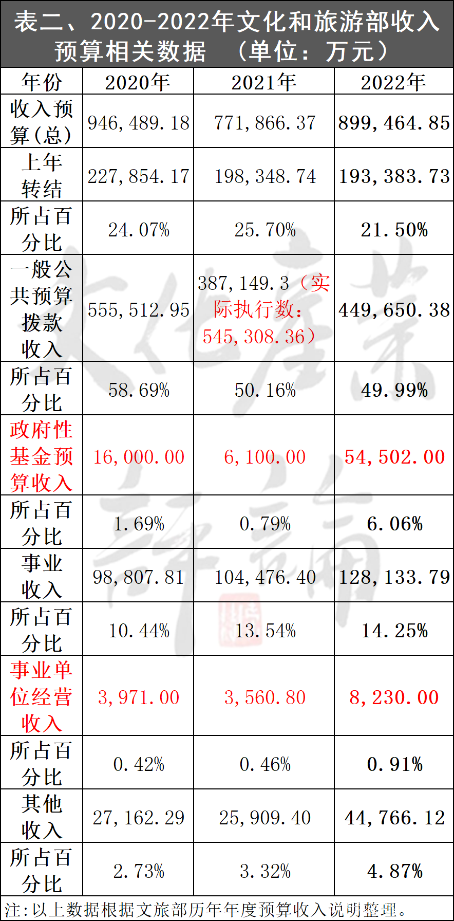 縱觀2020年至2022年“事業收入”一欄(詳見表二),2020年收入為98,807.81萬元、2021年收入為104,476.4萬元、2022年收入為128.133.79萬元,所佔比例分別為10.44%、13.54%和14.25。反映出了,文旅部推動文旅事業高質量發展取得了明顯成效。