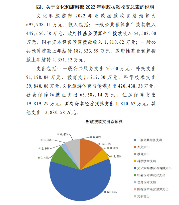 與此同時,文旅部2022年財政撥款收支總表的説明顯示,2022年財政撥款收支總預算為692,938.11萬元。其中,文化旅遊體育與傳媒支出420,438.38萬元,佔財政撥款支出總預算的60.67%。比2021年文化旅遊體育與傳媒支出373,141.09萬元,增加了47,297.29萬元,所佔比例(2021年佔比63.02%)下降了2.35%。