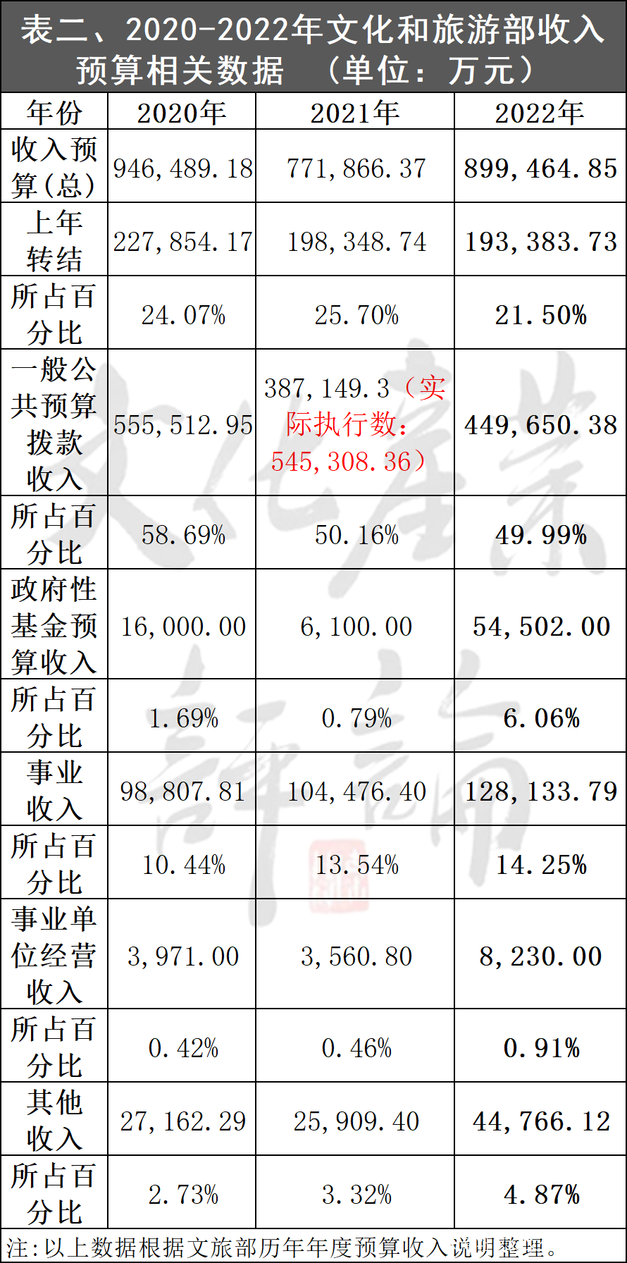 文化產業評論(ID:whcypl)梳理發現,**2020年至2022年文旅部收入預算總體呈逐年下降趨勢(詳見表二)。**雖然2022年收支總預算均為899,464.85萬元,比2021年總收支預算771,866.37萬元,增加了127,598.48萬元,同比增加約16.5%;但相比2020年946,489.18萬元,減少了47,024.33萬元,下降了近5%。