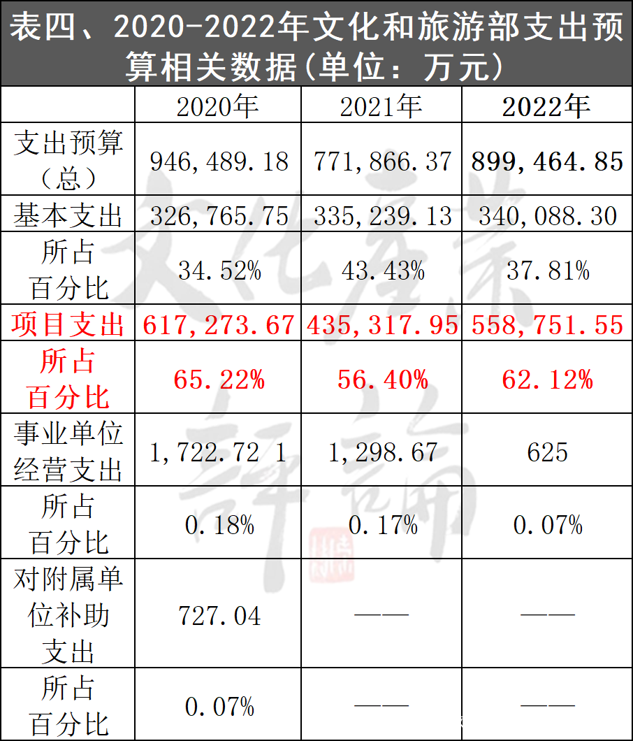 縱觀三年支出數據(詳見表四),在總的支出預算中佔比最高是“項目支出”。根據《2022年部分項目文本和目標績效表》顯示,2022年項目支出重點用於政府主導和扶持的對外交流、“一帶一路”文化和旅遊交流合作、港澳台文化傳承、舉辦國際藝術節等項目支出。