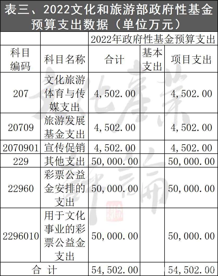 此外,在2022年政府性基金預算支出方面,文旅部2022年政府性基金預算當年撥款54,502.00萬元,比2021年(6,100.00 萬元)增加344.00萬元。其中,國家藝術基金50,000.00萬元,2021年當年的國家藝術基金為0.00萬元;旅遊發展基金4,502.00萬元,比2021年(6,100.00 萬元)增加344.00萬元。