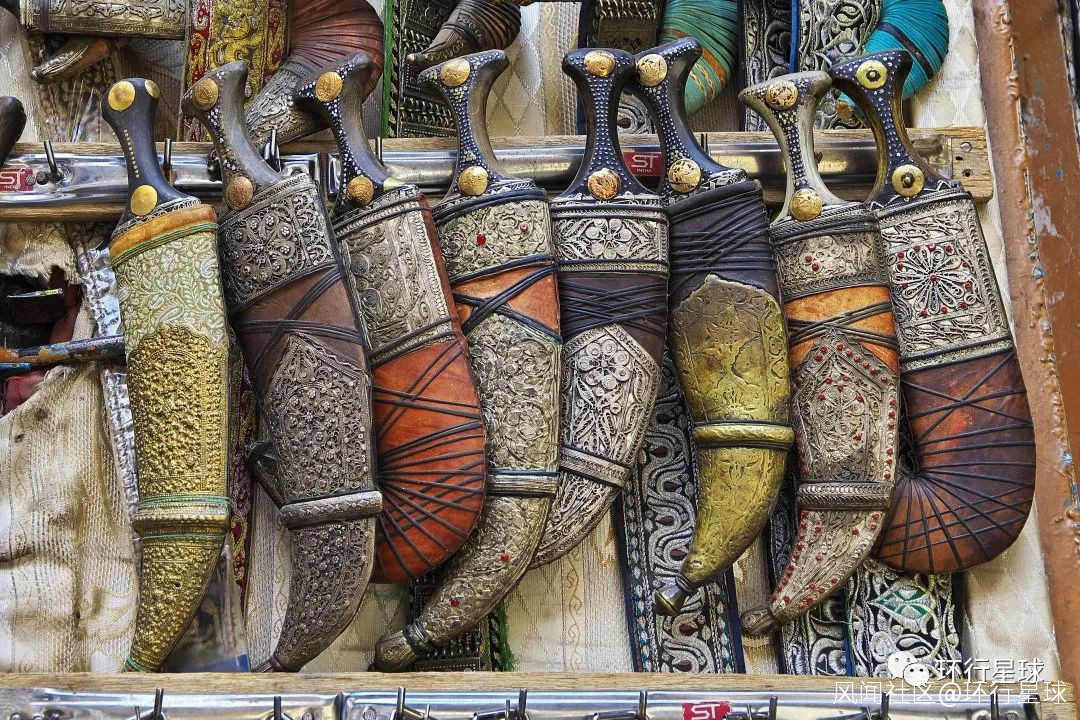 好的腰刀不僅堅硬鋒利,刀鞘和刀柄上還包着一層金或銀,並且在金銀上做鏤空和雕花,鏤空處還鑲嵌各種寶石。要從也門帶什麼紀念品的話,那腰刀絕對是不二之選。