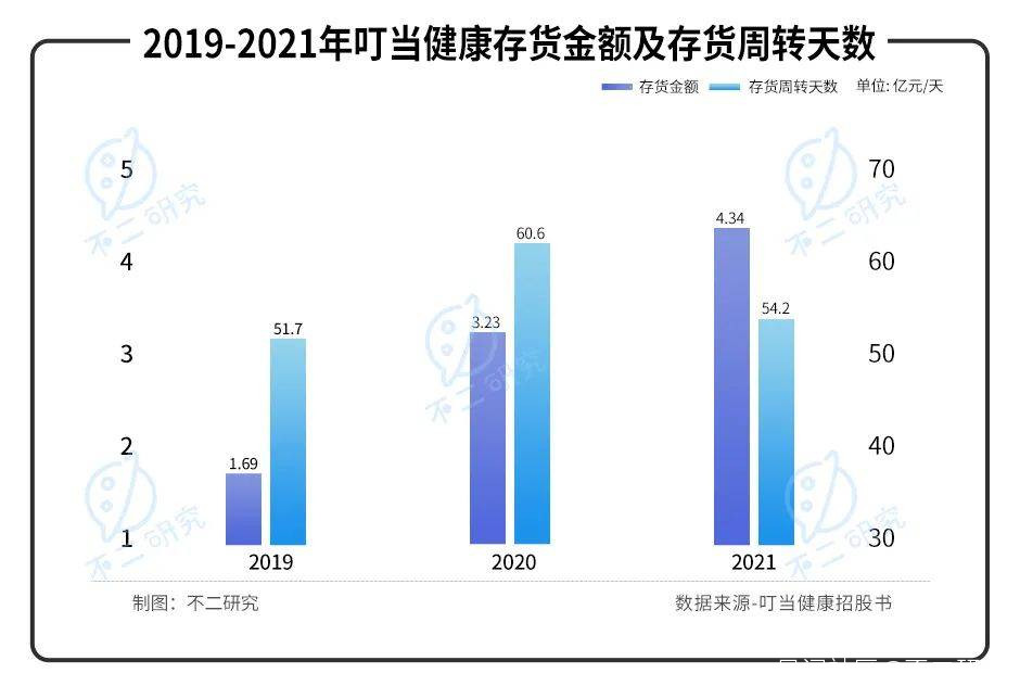 2019-2021年,叮噹健康的存貨金額分別為1.69億元、3.23億元和4.34億元,據此前招股書顯示,2018年的存貨金額為0.63億元,同比增速分別為168.72%、91.91%和34.18%。存貨週轉天數分別為51.7天、60.6天和54.2天。