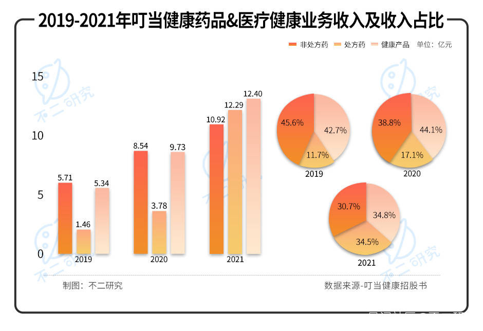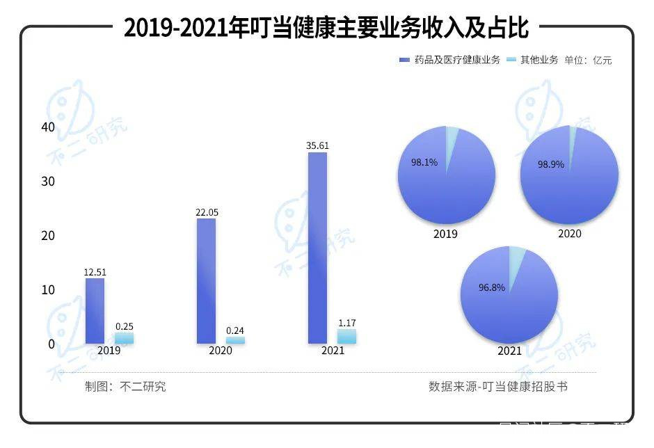 據招股書顯示,2019-2021年,來自藥品及醫療健康業務的收入分別為12.51億元、22.05億元和35.61億元,佔總收入的98.1%、98.9%和96.8%,據此前招股書顯示,2018年該項業務收入為5.62億元,同比增速分別為122.5%、76.2%和61.5%。