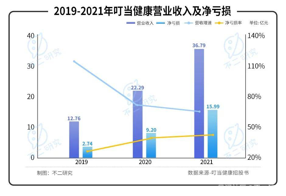 據招股書顯示,2019-2021年,叮噹健康的收入分別為12.76億元、22.29億元和36.79億元,據此前招股書顯示,2018年的收入為5.85億元,可以得出其同期營收同比增速分別為118.2%、74.7%和65.1%。