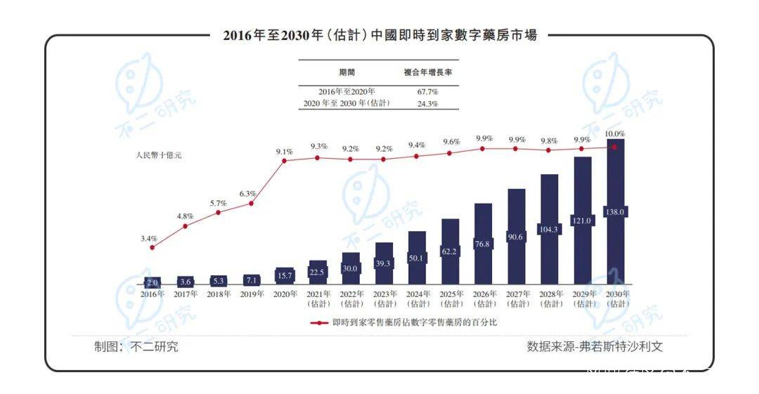 據弗若斯特沙利文報告,2016年至2020年,即時到家數字藥房市場以67.7%的複合年增長率自2016年的20億元開始大幅增長,預計2030年將達到1380億元,複合年增長率為24.3%。此外,預計數字零售藥房市場上的即時到家數字藥房的佔比將從2020年的9.15%增加至2030年 的10.0%。