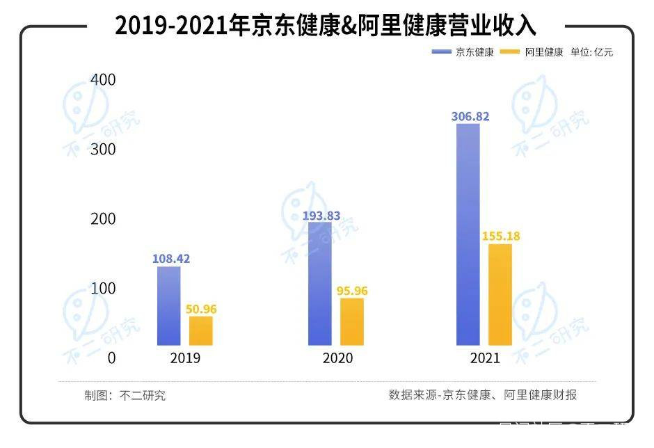 據此前京東健康財報顯示,2019-2021年,其收入分別為108.42億元、193.83億元和306.82億元。同期,阿里健康財報顯示,其收入分別為50.96億元、95.96億元和155.18億元。