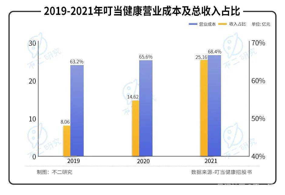據招股書顯示,2019-2021年,叮噹健康的營業成本分別為8.06億元、14.62億元和25.16億元,佔總收入的63.2%、65.6%和68.4%。