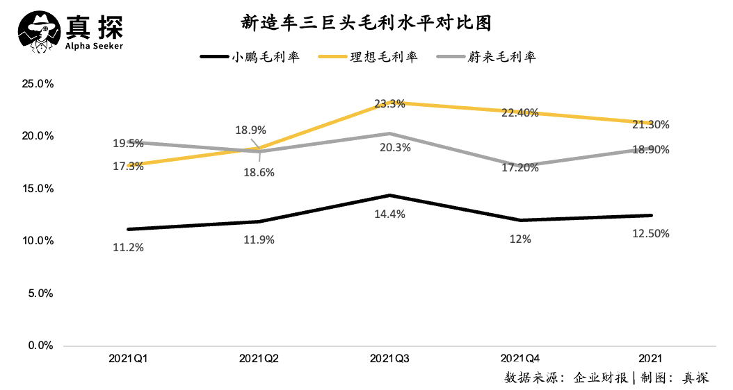 三家之中,最“能賺”的一直是理想。去年第四季度,理想的單車毛利率達到了22.3%,全年該項數據也保持在了20%以上。而三家中價格定位最低的小鵬,單車毛利率也是最低的,2021年度,其汽車毛利率(汽車毛利潤佔汽車銷售收入百分比)為11.5%,相比去年的3.5%,卻是有了大幅度提升。