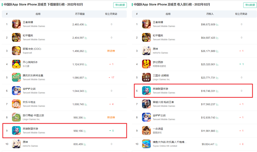 如果你再打開七麥數據的 App Store 2 月份遊戲收入榜,會發現LOL 手遊排到了第 6 位,下載榜也到了第 9 位。