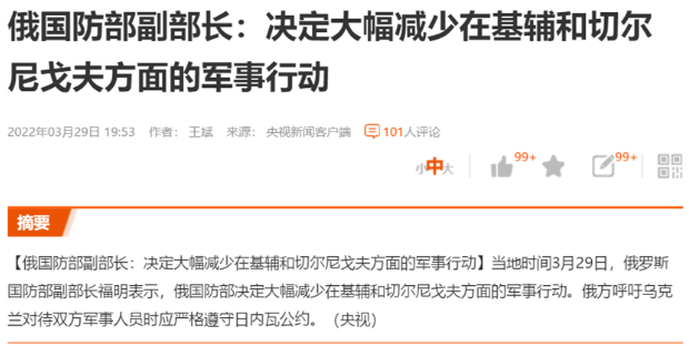 今天俄烏衝突傳來一個轉折性的消息:俄羅斯國防部表示,俄羅斯決定大幅減少在基輔和切爾尼戈夫方面的軍事行動。