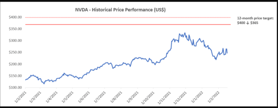 考慮到最近的市場波動引發了半導體股票廣泛的估值多次收縮,以及不斷增加的宏觀經濟逆風仍處於不穩定、未解決的狀態,我們將 2022 年的目標價從400美元上修至 365 美元。具體而言,我們已將之前估值分析中使用的退出倍數從 47.8 倍下調至 43.5 倍,以反映今年剩餘時間的預期市場情緒。我們調整後的估值分析中應用的所有其他關鍵假設(即 12.1% 的 WACC 和現金流量)與之前的預測保持不變,因為仍然可以合理確定 NVIDIA 將繼續表現出基本面的優異表現。