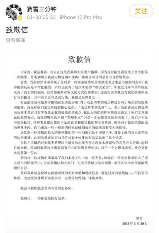 2. 賽雷三分鐘就“冒充買不到菜的長春人接受外媒採訪”道歉