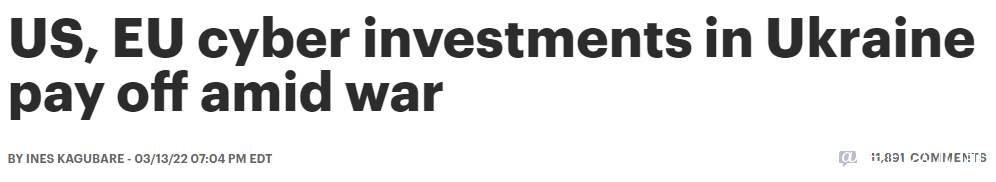 另一方面,在 2015 年電網黑客攻擊和 2017 年 Petya 惡意軟件攻擊之後,西方開始積極投資於烏克蘭的網絡防禦。美國常務副國務卿温迪·謝爾曼表示,自 2017 年以來,美國已投資4000萬美元幫助烏克蘭發展其信息技術部門。在衝突前的幾周和幾個月裏,美國和歐盟部署了一個網絡戰專家團隊,包括由12名專家組成的歐盟快速網絡反應小組和美國網絡司令部的“前鋒”特遣部隊。