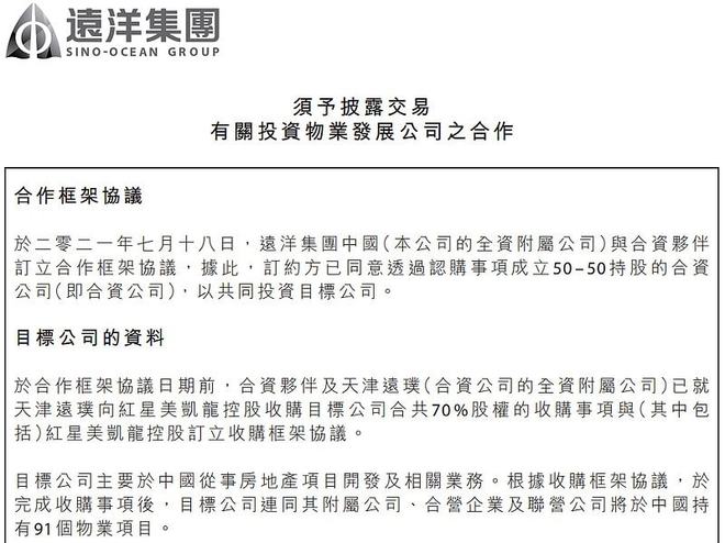 2021年7月,遠洋集團發佈公告,遠洋集團、遠洋資本與紅星美凱龍控股簽署協議,以40億元收購紅星地產70%股權 ,三方將有效持有紅星地產母公司重慶紅星美凱龍企業發展有限公司35% 、35% 、30%的股權 。據瞭解,此次收購後,紅星地產在未來2年每年將會為集團貢獻300-400億元的銷售規模,其中絕大多數的銷售額則是來源於華東、華中以及華西區域。