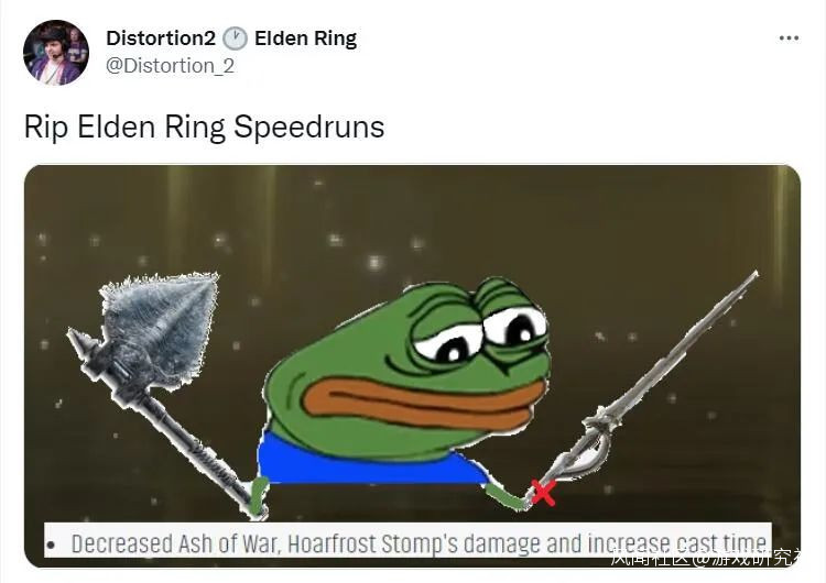 同時,對於速通路線來説,武器的屬性要求和獲取難度同樣需要儘可能低,升級所需材料也要一切從簡,這就把選擇縮小到了需求失色鍛造石的特殊武器池裏。於是,在無需擊殺BOSS的前期地圖湖之利耶尼亞中,這把自帶老寒腿的低需求特殊武器凍殼斧很快脱穎而出。不管是讓玩家怨聲載道的神皮二人組,還是冠有“糞怪”之名的艾爾登之獸,在強化後的老寒腿下都是幾腳踩趴的手下敗將。