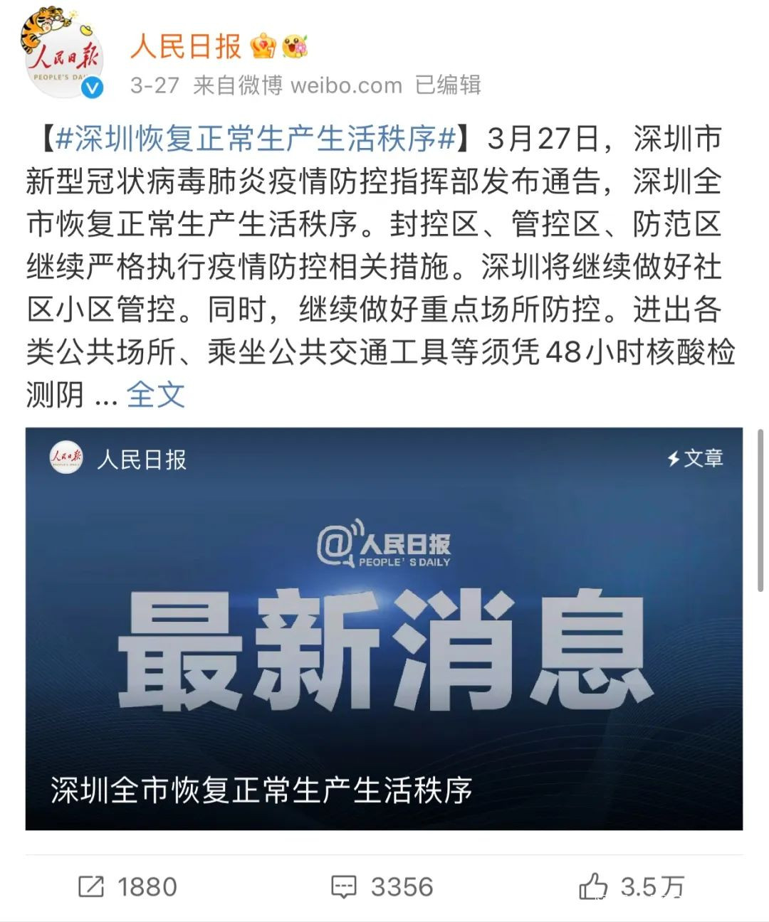 同一天,國家衞健委宣佈“深圳疫情已得到初步控制”,社會面動態清零,疫情形勢整體向好。