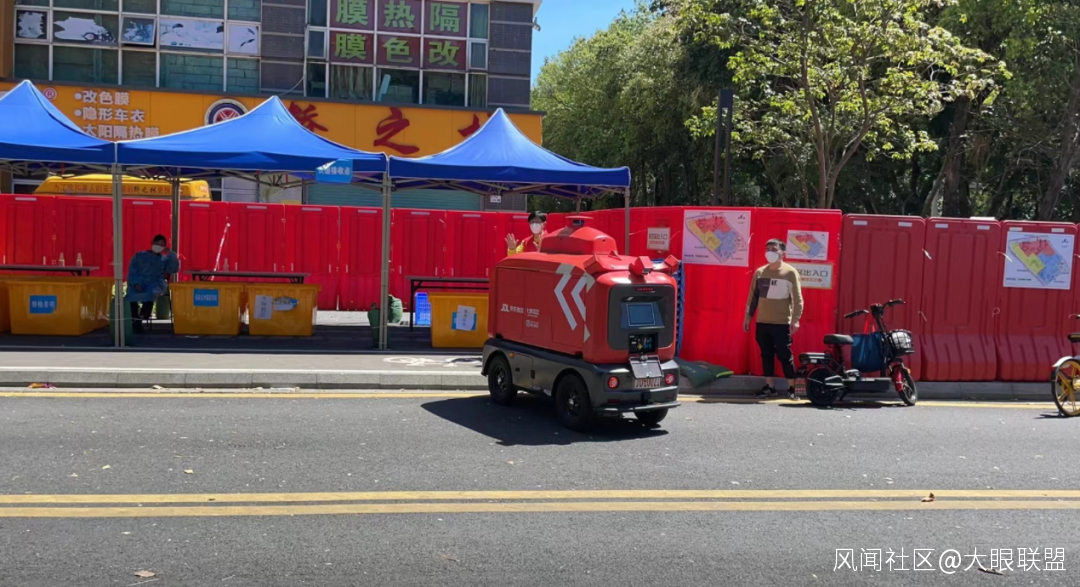 在疫情管控區內的消費者,通過手機下單後,超市將打包好的商品放入智能快遞車中,智能快遞車就會自動上路,完成配送工作。