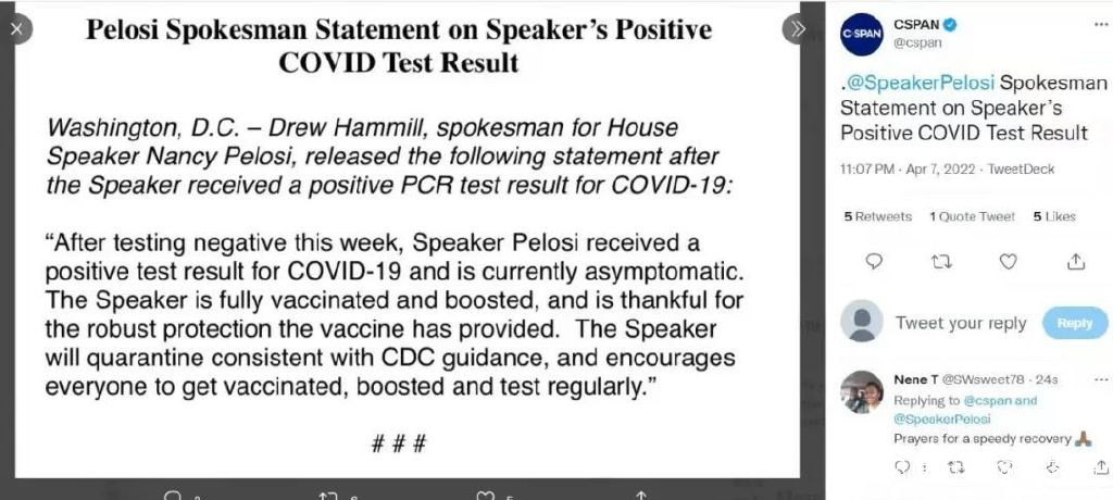 佩洛西“訪台”消息一出,中方就回以表態三連擊,要求立即取消竄訪計劃。很快,佩洛西辦公室發言人對外宣佈,佩洛西新冠病毒檢測呈陽性,開始隔離,亞洲之行推遲——中國網友調侃,這堪稱“戰術性陽性”啊。
