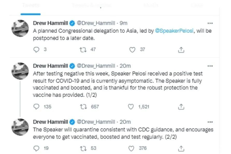 佩洛西的發言人已經説了,因為她新冠陽性,所以亞洲之行推遲了。