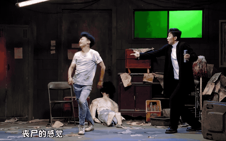 然後他做了一個決定,他決定在這個密室裏當着大家的面調整他的表演。這個時候演喪屍的演員蔣龍自然就非常尷尬,這個喜劇的衝突就產生了——老師越熱情,蔣龍就越尷尬。