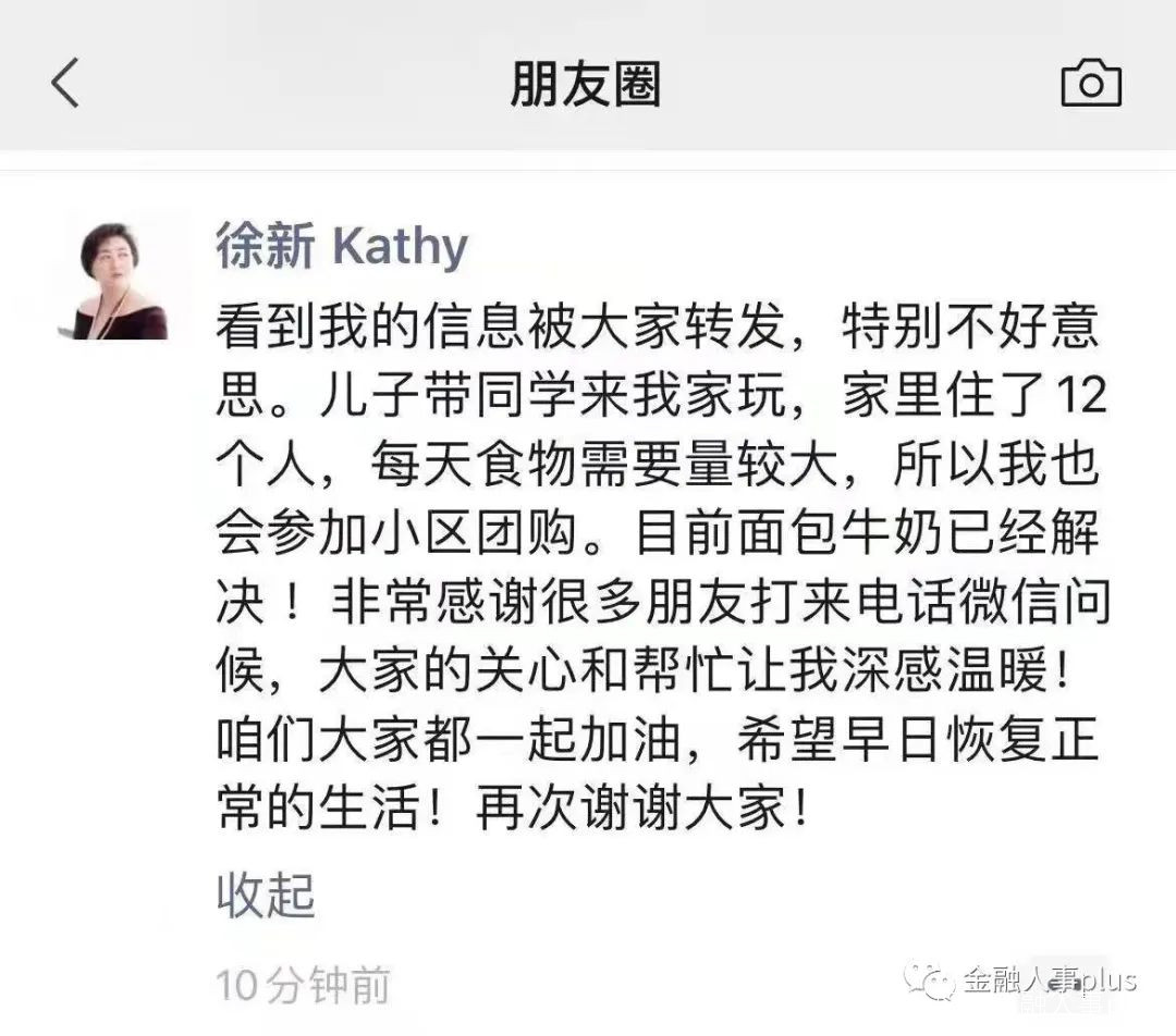 事件的最後,徐新女士在朋友圈回覆大家的疑問,也感謝了大家的幫助,兒子的朋友在家裏做客,遇上疫情,每天的食物需求量都比較大。