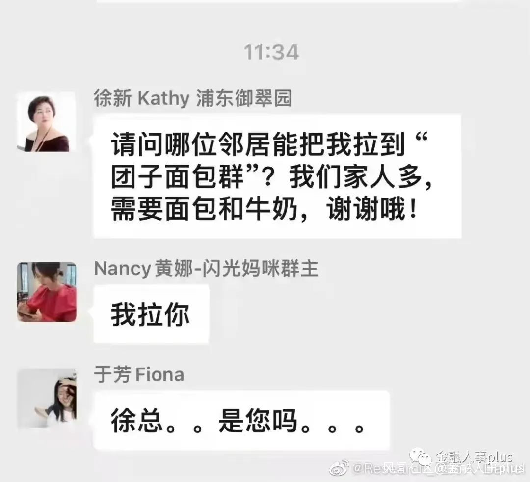 今日,一張疑似風投女王徐新為團購牛奶麪包到處找團購的聊天記錄截圖在網上流傳。叮咚、美團、京東的投資人居然親自下場搶麪包,看來還有上海高端奢侈品服務業(詳情點擊《建行大氣出擊,捲進高端服務業》)沒有捲到的人,徐新女士是真得低調啊!