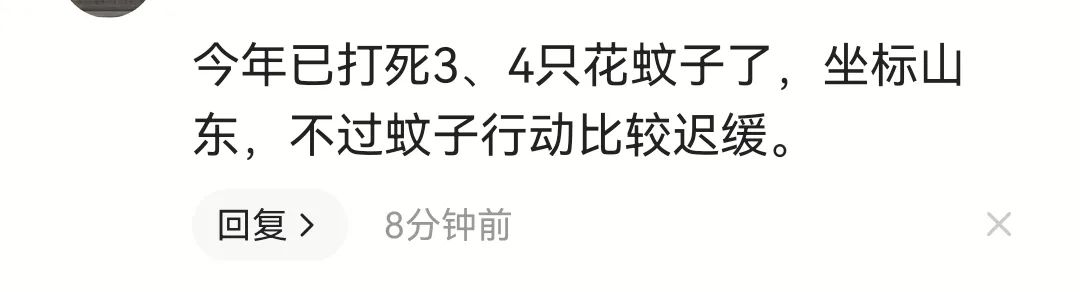 又查了一下“吉林一般什麼季節出現蚊子?”搜索結果是“4月開始出現”。且北方以庫蚊類為主,花蚊相對要少。在天氣還很冷,不該大量出現蚊子的季節,出現本不在當地多見的花蚊子,怎麼看都顯得異常?