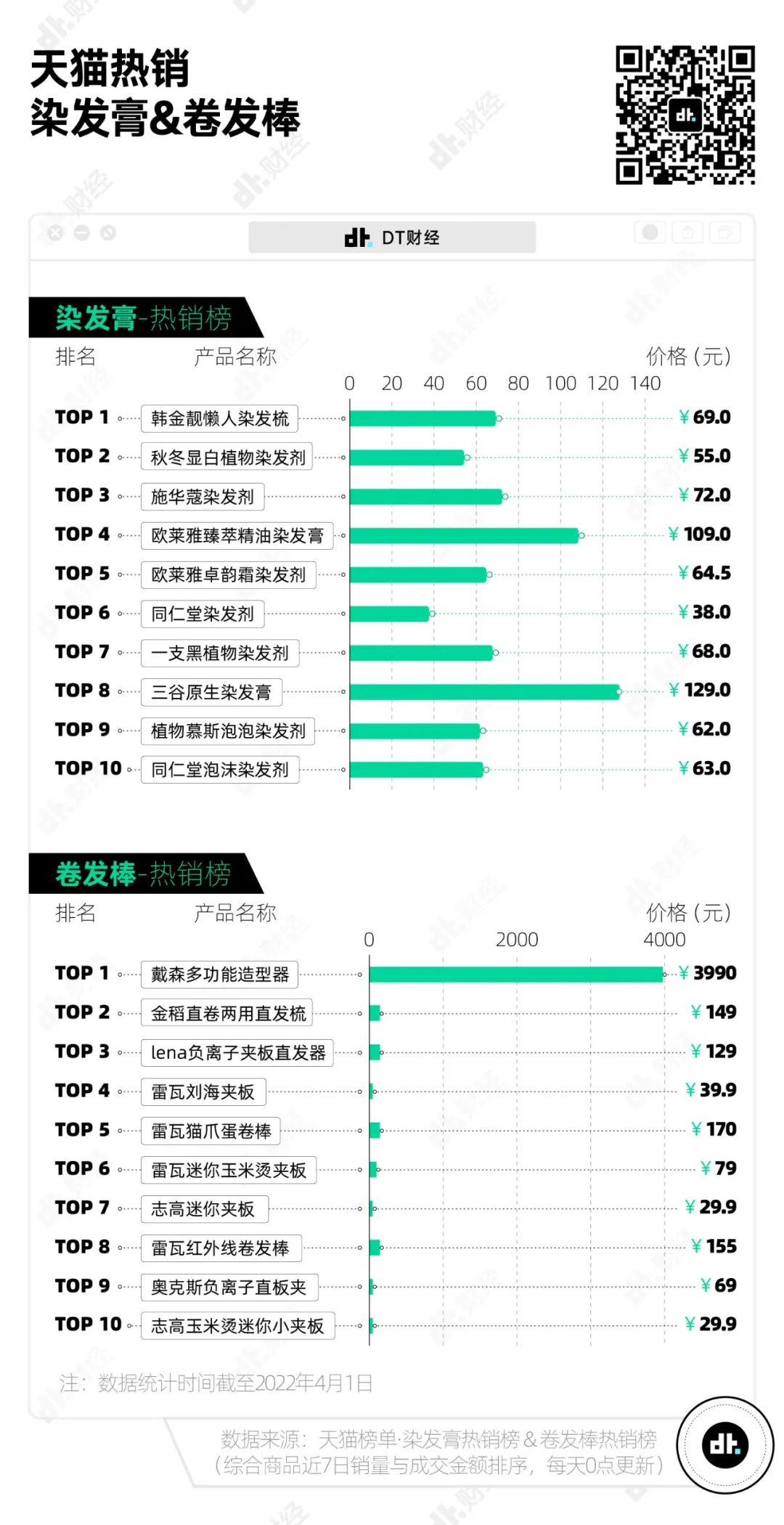 翻翻購物平台就能看出來。在天貓最熱賣的燙染工具中,賣得最好的10款染髮膏平均價格只要73元,也就是説,平均幾十塊錢的價格,就有機會獲得小紅書上人人豔羨的顯白温柔氣質髮色。